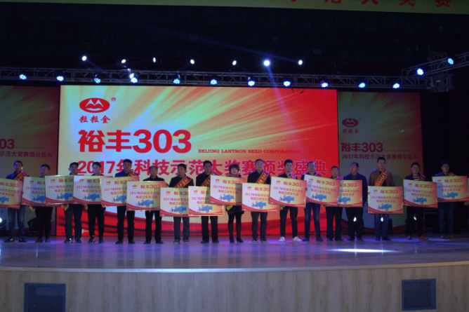 2017年11月16日,由北京聯(lián)創(chuàng)種業(yè)股份有限公司舉辦的2017年裕豐303科技示范大獎(jiǎng)賽頒獎(jiǎng)盛典在安徽蕭縣會(huì)議中心隆重舉行。安徽省蕭縣人民政府副縣長(zhǎng)李建明、蕭縣農(nóng)委、農(nóng)技推廣中心、蕭縣人民廣播電臺(tái)、北京聯(lián)創(chuàng)種業(yè)公司總裁彭澤斌、副總裁史澤琪、粒粒金事業(yè)部總經(jīng)理王青才等有關(guān)領(lǐng)導(dǎo)以及來自河南新農(nóng)村頻道、山東農(nóng)科頻道、河北電視臺(tái)、農(nóng)民日?qǐng)?bào)、河北農(nóng)民報(bào)、河南科技報(bào)、江蘇科技報(bào)、安徽種業(yè)、農(nóng)財(cái)寶典等有關(guān)媒體朋友參加了本次頒獎(jiǎng)盛典;來自北京、天津、河南、山東、河北、安徽、江蘇七省市廣大農(nóng)技推廣商及周邊種植農(nóng)戶2000多人也參加了此次頒獎(jiǎng)盛典。北京聯(lián)創(chuàng)種業(yè)總裁彭澤斌現(xiàn)場(chǎng)宣讀了《北京聯(lián)創(chuàng)種業(yè)關(guān)于對(duì)2017年裕豐303科技示范戶表彰的決定》,副總裁史澤琪作《北京聯(lián)創(chuàng)種業(yè)關(guān)于2017年裕豐303科技示范工作實(shí)施的報(bào)告》,內(nèi)容精彩繪呈,引起與會(huì)者陣陣熱烈掌聲。