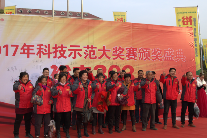 現(xiàn)場(chǎng)針對(duì)2017年221名裕豐303優(yōu)秀種植示范戶分別頒發(fā)十萬轎車、金磚、電動(dòng)三輪車獎(jiǎng)品,以表彰他們科學(xué)種田、示范推廣優(yōu)良品種裕豐303所作出的突出貢獻(xiàn)。其中一等大獎(jiǎng)價(jià)值十萬元的轎車被安徽蕭縣酒店鎮(zhèn)胡孝蘭摘得,其中參賽產(chǎn)量為2252.9斤;二等獎(jiǎng)價(jià)值5000元的金磚分別被河南省西華縣、滑縣、山東省梁山縣、陽信縣、河北省臨漳縣、任丘市、安徽利辛縣、泗縣、江蘇灌云到等20個(gè)縣市示范戶獲得,其中山東省平度市張舍鎮(zhèn)石賢勝畝產(chǎn)達(dá)2108斤、滕州市張汪鎮(zhèn)張佑代畝產(chǎn)達(dá)2025.36斤、河北省灤平縣大屯鄉(xiāng)王國(guó)強(qiáng)畝產(chǎn)達(dá)2040.28斤;二等獎(jiǎng)20名平均畝產(chǎn)達(dá)1800以上。